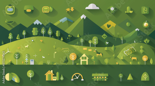 Environment: Icons such as trees, renewable energy sources (like wind turbines or solar panels), and recycling symbols.