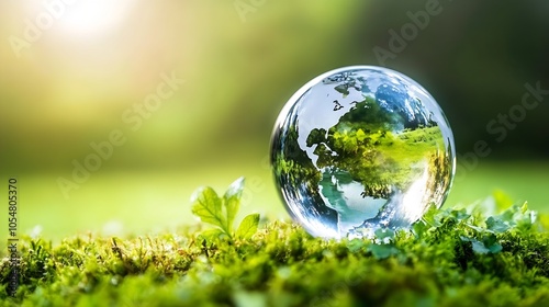 Environmental conservation represented by a glass earth globe on lush foliage reflecting ecological balance : Generative AI