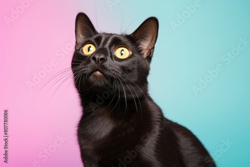 Environmental portrait photography of a happy bombay cat belly showing in pastel or soft colors background