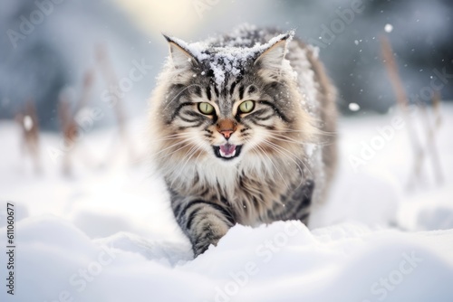 Environmental portrait photography of a smiling norwegian forest cat leaping against a snowy winter scene. With generative AI technology