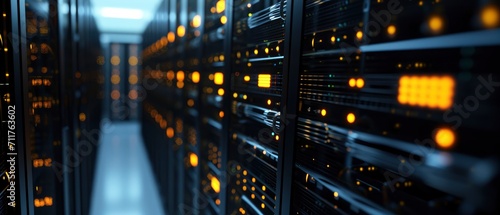 Envision a visually captivating server room, Rows of high-tech servers neatly organized in racks create a sleek backdrop.