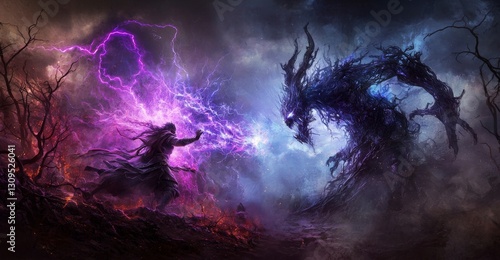 Epic clash of hidden powers enchanted realm fantasy art dark environment dynamic viewpoint magic concept