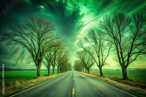 Epic green sky over a road with barren trees at eye level