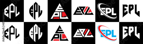 EPL letter logo design in six style. EPL polygon, circle, triangle, hexagon, flat and simple style with black and white color variation letter logo set in one artboard. EPL minimalist and classic logo