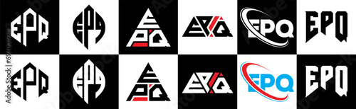 EPQ letter logo design in six style. EPQ polygon, circle, triangle, hexagon, flat and simple style with black and white color variation letter logo set in one artboard. EPQ minimalist and classic logo