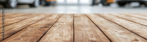 Equipment workshop background concept. A close-up view of wooden floor planks in a spacious area, highlighting texture and grain, with blurred vehicles in the background.