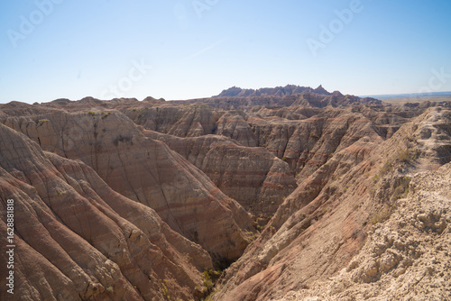 Eroded rock formations under blue sky in Badlands National Park, South Dakota