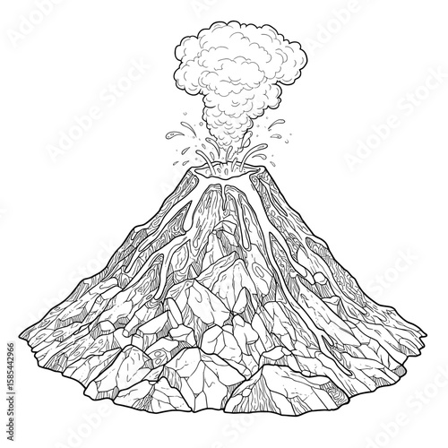Erupting Volcano Illustration of flowing lava and steam clouds in a black and white drawing