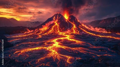 Erupting volcano in nature landscape at sunset capturing lava flow and ash clouds
