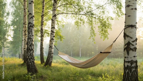 Escape to serenity with a hammock between birch trees on a sunlit summer morning for ultimate relaxation