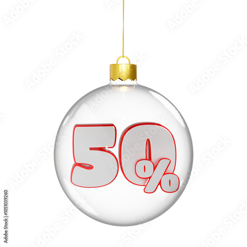 Esfera transparente con descuento navideño. Render 3D sobre fondo transparente. Ventas de navidad y año nuevo. Porcentaje del 50%