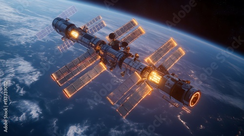 ESG, sustainability and innovation: A clean energy space station orbiting Earth, harvesting solar energy with massive satellite panels, glowing holographic control interface, sci-fi ultra-realistic.