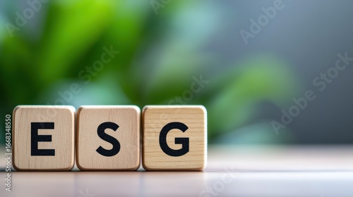 ESG Wooden Blocks: Environmental, Social, and Governance concepts symbolized on wooden blocks arranged neatly on a wooden surface, with blurred green foliage in the background.