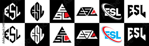 ESL letter logo design in six style. ESL polygon, circle, triangle, hexagon, flat and simple style with black and white color variation letter logo set in one artboard. ESL minimalist and classic logo