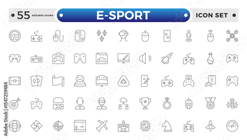 E-Sport outline icon set. Gaming icon elements containing points and life bars, console, player, chess, multiplayer, casino and mobile game icons. Video games, gaming. Editable stroke outline icon.
