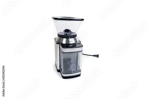 Espresso bean coffee grinder. brand new and clean, front view over white.