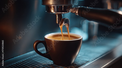 Espresso coffee pouring into black cup from machine, creating rich and warm atmosphere for perfect morning drink