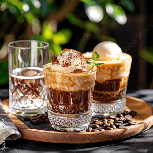 Espresso ice cream float, decadent coffee layers, elegant glassware, sun-dappled shadows, 35mm lens, inviting cafe corner, soft focus, artistic composition