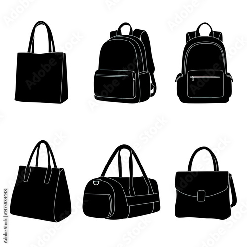 Essential Accessory Array: A set of stylish bags, each a unique silhouette of functionality and fashion. From sleek tote bags to practical backpacks, this image showcases a variety of bag designs.