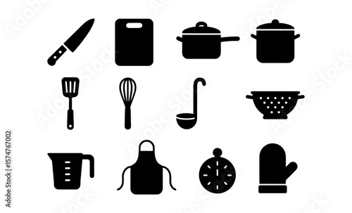 Essential kitchen tool silhouettes: knife, utensils, cookware icons