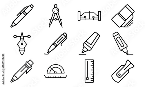Essential Stationery and Drawing Tools Icons – Pen, Fountain Pen, Marker, Highlighter, Compass, Ruler, Protractor, Sharpener and Design Equipment Outline Set for School, Office and Creative Work