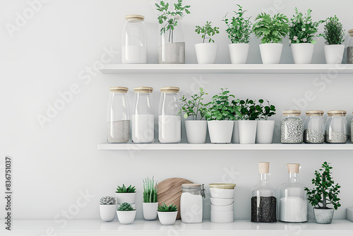 Estantería ordenada con tarros de cristal y maceteros con plantas aromáticas