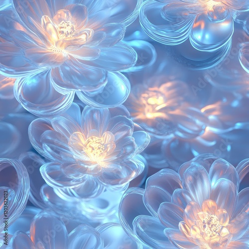 Ethereal 3D blossoms with luminous, moon - like petals and radiant glow effects . Seamless abstract 3d pattern background