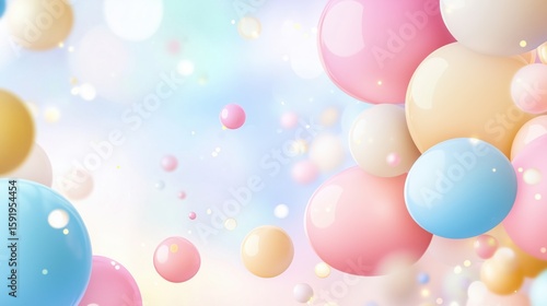 Ethereal background with floating pastel balloons and iridescent orbs on a dreamy light blue and pink gradient. Festive abstract celebration, perfect for party invitations or cheerful designs.
