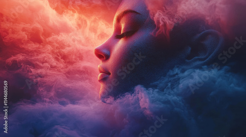 Ethereal Beauty in a Dreamy Cloudscape with Colorful Swirls of Red and Blue Light Accentuating the Serene Face of a Woman Lost in Thought
