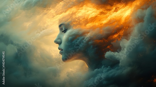 Ethereal beauty merges with the sky. A woman's serene face blends into a vibrant, dreamlike cloudscape, evoking peace and introspection. Abstract Medical Pain