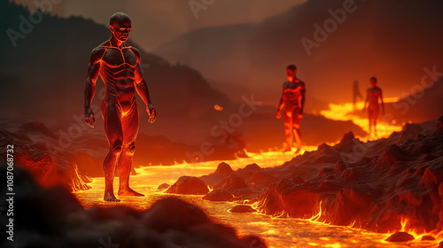 Ethereal Bodies of Lava Suspended in Dark Space Surrounded by an Illuminating Lava Floor Creating a Hellish Atmosphere