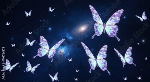 Ethereal Butterflies Gliding Through a Starry Space with Galaxies in the Background