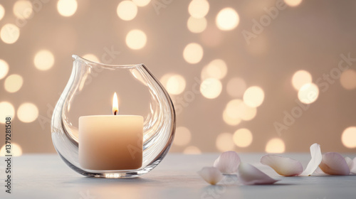 Ethereal candlelight in curved glass with bokeh and soft petals