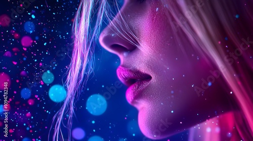 Ethereal close-up of a woman's profile with vibrant bokeh lights