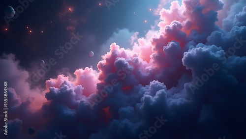 Ethereal Clouds at Twilight: Pink-tinged clouds meander across a dusky sky, illuminated by distant stars and planets.