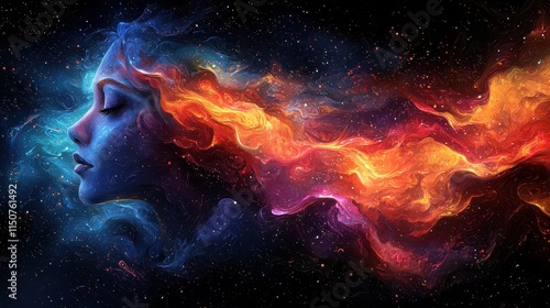 Ethereal Cosmic Dreamscape with Flowing Colors and Serene Expression