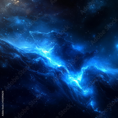 Ethereal dark blue nebula with glowing white waves and countless stars in deep space