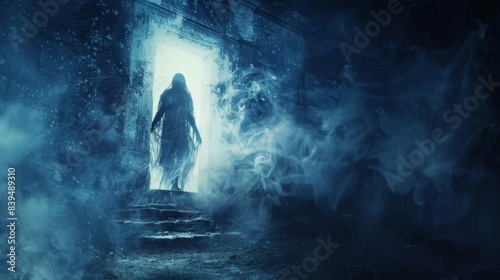 Ethereal figure emerging from an illuminated doorway amidst mist, capturing a sense of mystery and otherworldly presence.