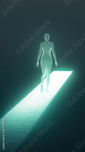 Ethereal Figure Walking on a Glowing Path in a Darkened Environment with Dreamlike Ambiance