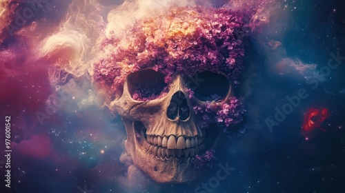 ethereal floral skull emerging from cosmic mist intricate bloom patterns forming skeletal structure haunting beauty blending life death and rebirth