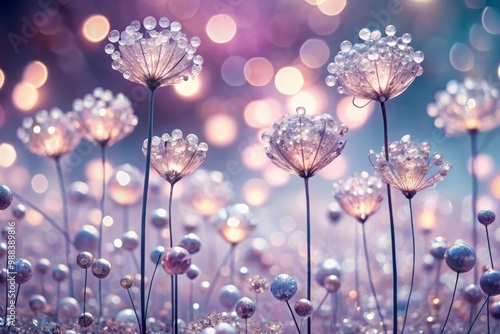 Ethereal flowers, crafted from crystalline structures, sway gently in a minimalist environment, lit by a soft, pinkish hue, evoking a sense of wonder.