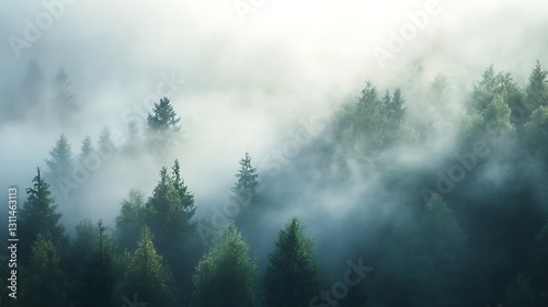 Ethereal forest landscape with evergreen trees engulfed in thick swirling mist