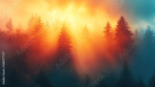 Ethereal Forest Landscape with Sun Rays and Fog, Dramatic Warm to Cool Blue Gradient Light Through Silhouetted Pine Trees