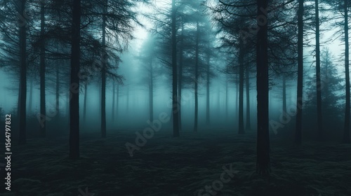 Ethereal forest scene with mist-shrouded trees creating a somber ambiance