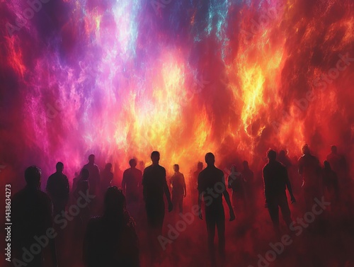 Ethereal Gathering: Silhouetted Figures Confronting a Spectrum of Light and Shadow, Navigating the Unknown, Reflecting the Enigma of Existence in a Mystic Realm