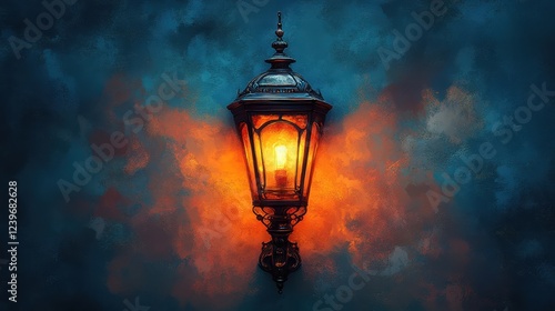 Ethereal Glow of a Vintage Street Lamp Illuminating a Textured Wall with Warm Luminescence Creating a Dramatic Contrast Against a Cool Background