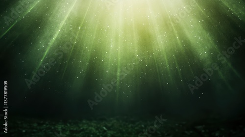 Ethereal green light rays illuminating underwater world with particles