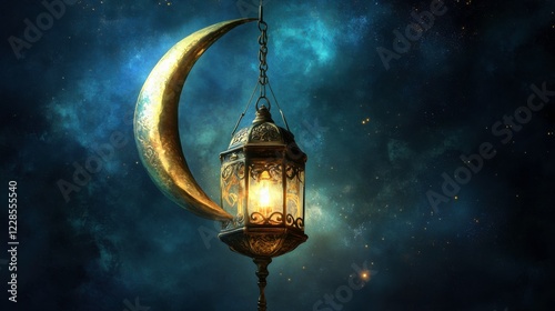 Ethereal Lantern with Crescent Moon Against Cosmic Background
