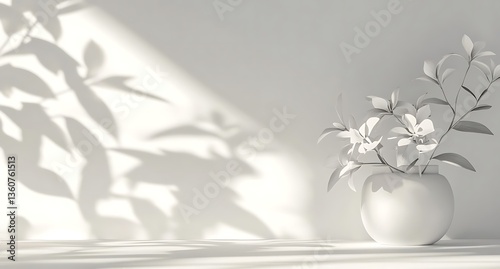 Ethereal light gray background with soft shadows of flowers, creating a dreamy, minimalist atmosphere. High-resolution, natural lighting, and clean lines enhance the abstract, atmospheric feel.