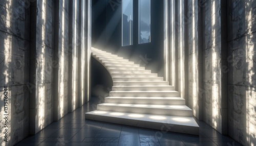 Ethereal Light Path Imagine a staircase made of light, glowing softly and creating reflections in a dark, misty environment.